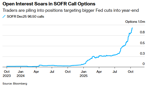 最近与安全隔夜融资利率(SOFR)相关的期权交易活动表明,市场正在押注美联储可能在下个月或 12 月的会议上降息 50 个基点。这超过了掉期掉期市场目前定价的两次 25 个基点的降息。