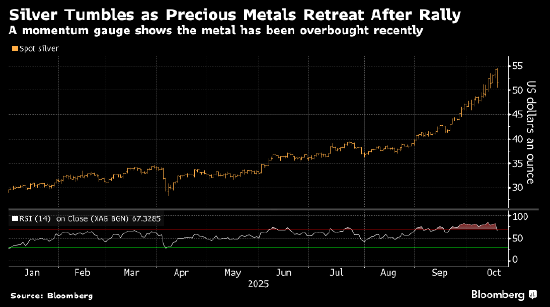 白银本周创下历史新高,周五逼近 54.50 美元/盎司,随后大幅下跌。增益旋转s看起来速度很快,强度也很大。衡量价格动能的相对指数显示,自 9 月底以来白银买盘极为火爆,预示着价格可能会出现调整。黄金也面临着类似的情况。